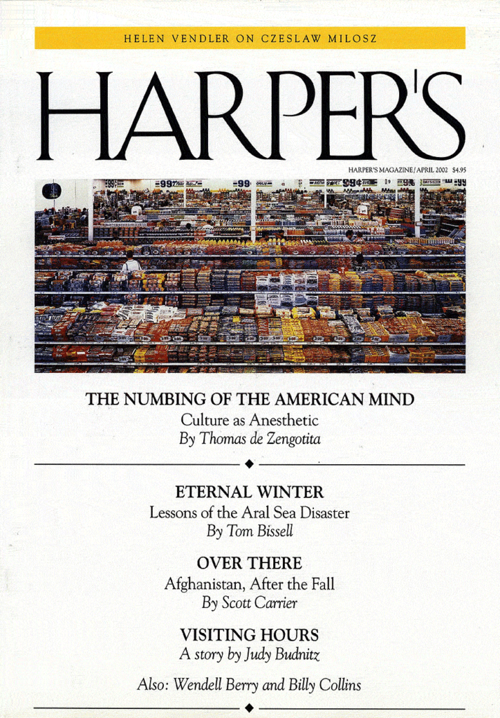 — Thomas de Zengotita, “The Numbing of the American Mind: Culture as Anesthetic” (Harper’s, April 2002)