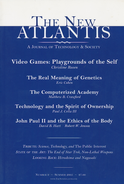 The newest issue of The New Atlantis (Summer 2005; available on-line here) provides further evidence that it is the most instructive and insightful publication examining the many facets of the relationship between technology and culture. Christine Rosen (a guest on Mars Hill Audio Journal Volume 70) continues her series of reflections on how some of the most private and personal technologies (iPods, TiVo, cosmetic surgery) shape our consciousness and our sense of personal identity and of the shape and texture of relationships. In “Video Games: Playgrounds of the Self,” Rosen shows why explicit sex and graphic violence are only the more superficial problems facing heavy game players.