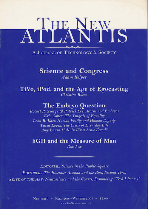 The embryo question presents us with some of the essential dimensions and deep tensions in the American character — including the devotion to technological progress, the fidelity to biblical morality, and the belief that all human beings are created equal. In the essays that follow, the authors explore the embryo question in full, seeking to guide the current policy debate and to grapple with more fundamental questions about out [sic] politics, our ideals, and our humanity.So reads the introduction to a three-part feature published in the Fall 2004/Winter 2005 edition of The New Atlantis: A Journal of Technology & Society. The feature, titled “The Embryo Question,” contains articles by Robert P. George and Patrick Lee, Eric Cohen, Leon R. Kass, Yuval Levin, and Amy Laura Hall. It identifies terms and analogies employed in the debate about whether or not human embryos should be destroyed for stem cell research, explicating and disclosing weaknesses in the arguments of those in favor while establishing a strong case in opposition. In the first two sections of the feature George, Lee, and Cohen discuss the framing of the debate and what is at stake in how it is framed. Section III finds Kass, Levin, and Hall responding, in turn, to Cohen’s article in section II.